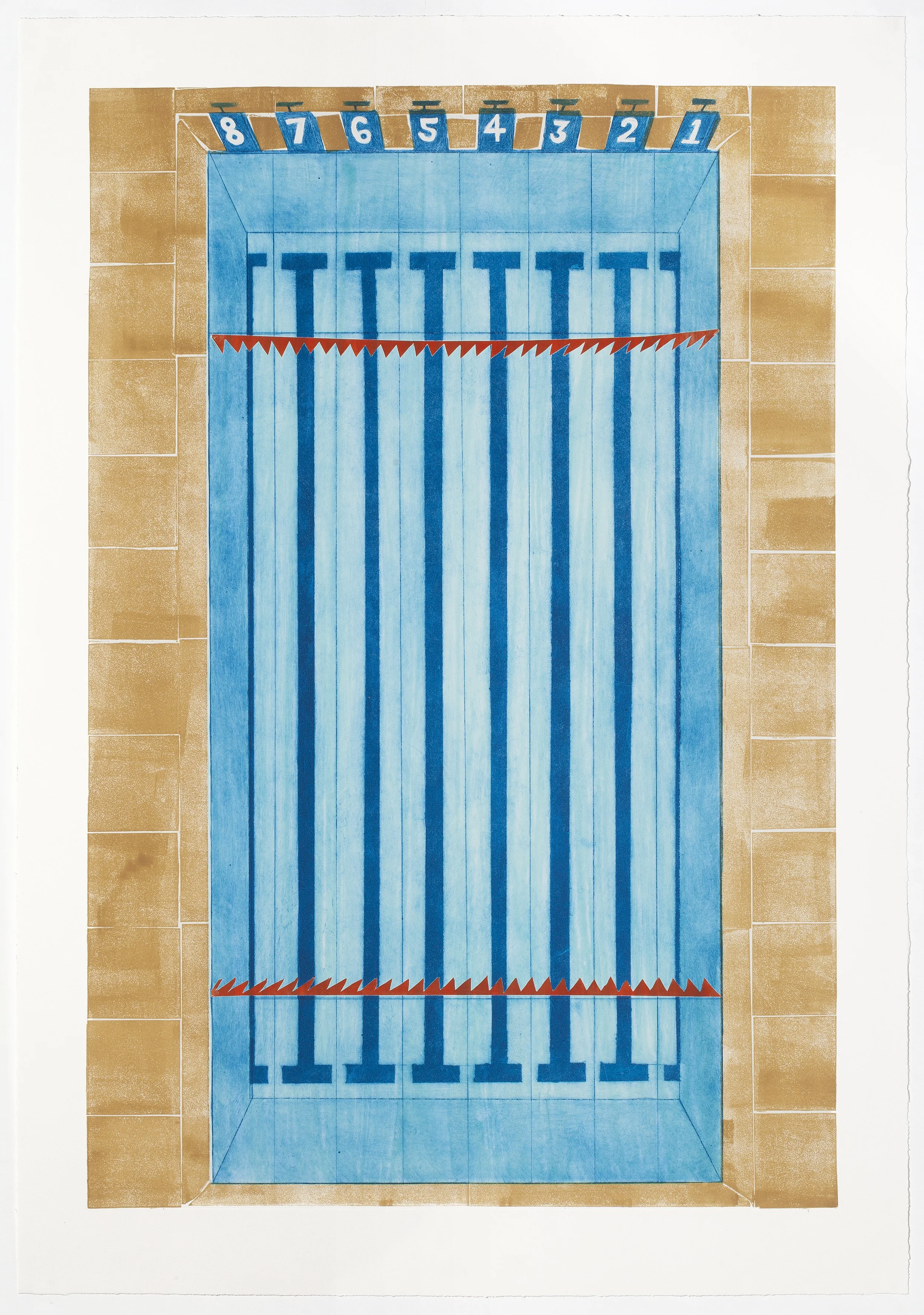 The Big Swimmer's Pool (blue) , 2024 Collagraph, watercolor, drypoint, carborundum and gouache on Arches 88 paper 36 x 24 in (91.44 x 60.96 cm) Paper size: 41 x 28.25 in (104.14 x 71.76 cm